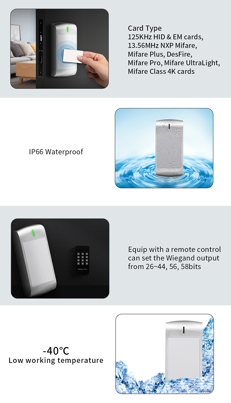 | Output Format | Wiegand 26~44, 56, 58 bits |